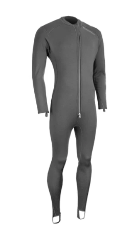 The Sharkskin Titanium 2 Front Zip Suit is a versatile thermal garment for water activities like diving and snorkeling, made with T2 material embedded with titanium nanoparticles to provide warmth equivalent to 5mm neoprene. It features a three-layer system that traps body heat, blocks wind and water, and wicks moisture, and a two-way front zipper for easy entry. The suit can be worn as a primary thermal layer in waters as cool